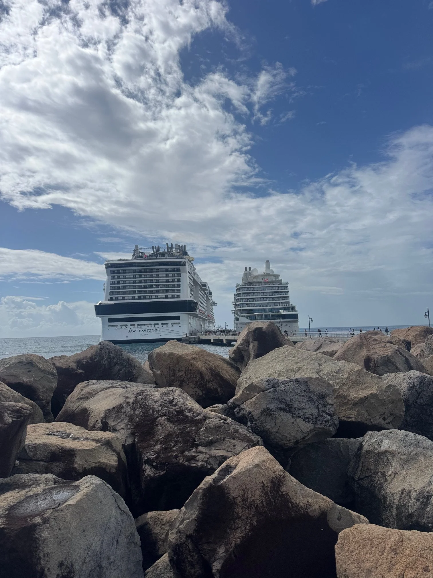 The petite Silver Ray takes just 702 passengers. The MSC Virtuosa, which I spotted in St. Kitts, takes 6334 passengers. Which would you rather experience?
